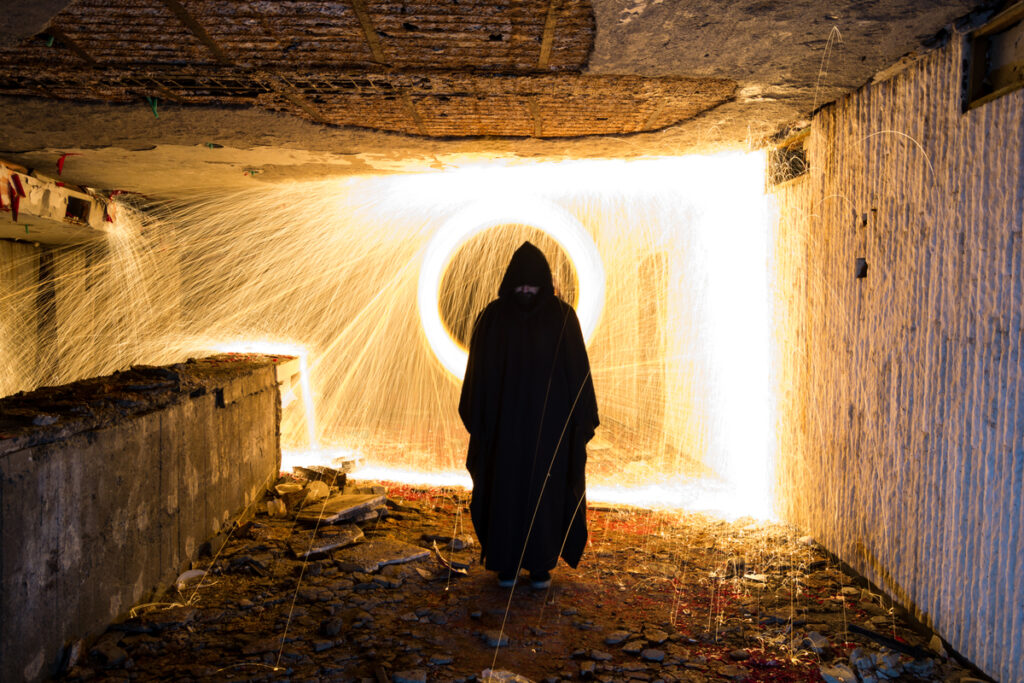 Человек в черном плаще перед светящимся кругом