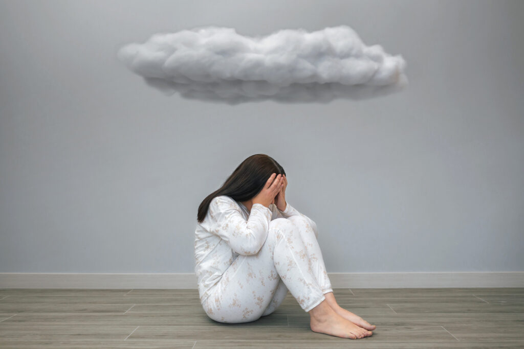 Женщина сидит под темным облаком